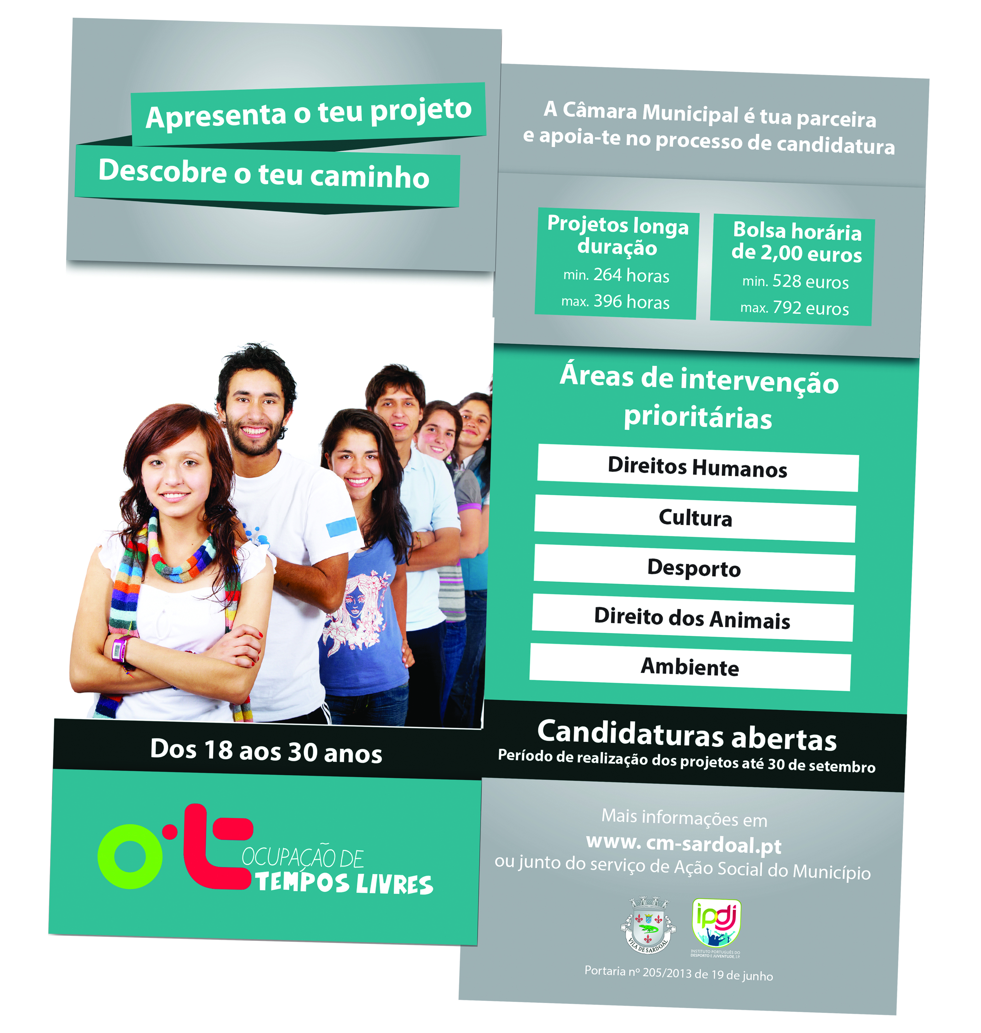 Este Município, no âmbito do Programa de Ocupação de Tempos Livres (OTL), promovido pelo Instituto Português do Desporto e Juventude (IPDJ), volta a estar disponível para participar como entidade parceira, para projetos apresentados na modalidade de Longa Duração. Através deste programa, esta Autarquia poderá ser parceira de projetos que possam vir a ser apresentados por jovens dinamizadores, que pretendam apresentar candidaturas em áreas como o Direitos Humanos; Cultura; Desporto; Direitos dos Animais e Ambiente. A realização dos projetos na modalidade das candidaturas de Longa Duração decorre até 30 de setembro, devendo os projetos ser apresentados até 30 dias antes do seu início, por jovens dinamizadores com idades compreendidas entre os 18 e 30 anos.